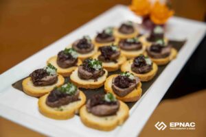 An elevated hors d’oeuvre featuring tender Filet Mignon Crostini, showcasing bold flavor and thoughtful presentation.